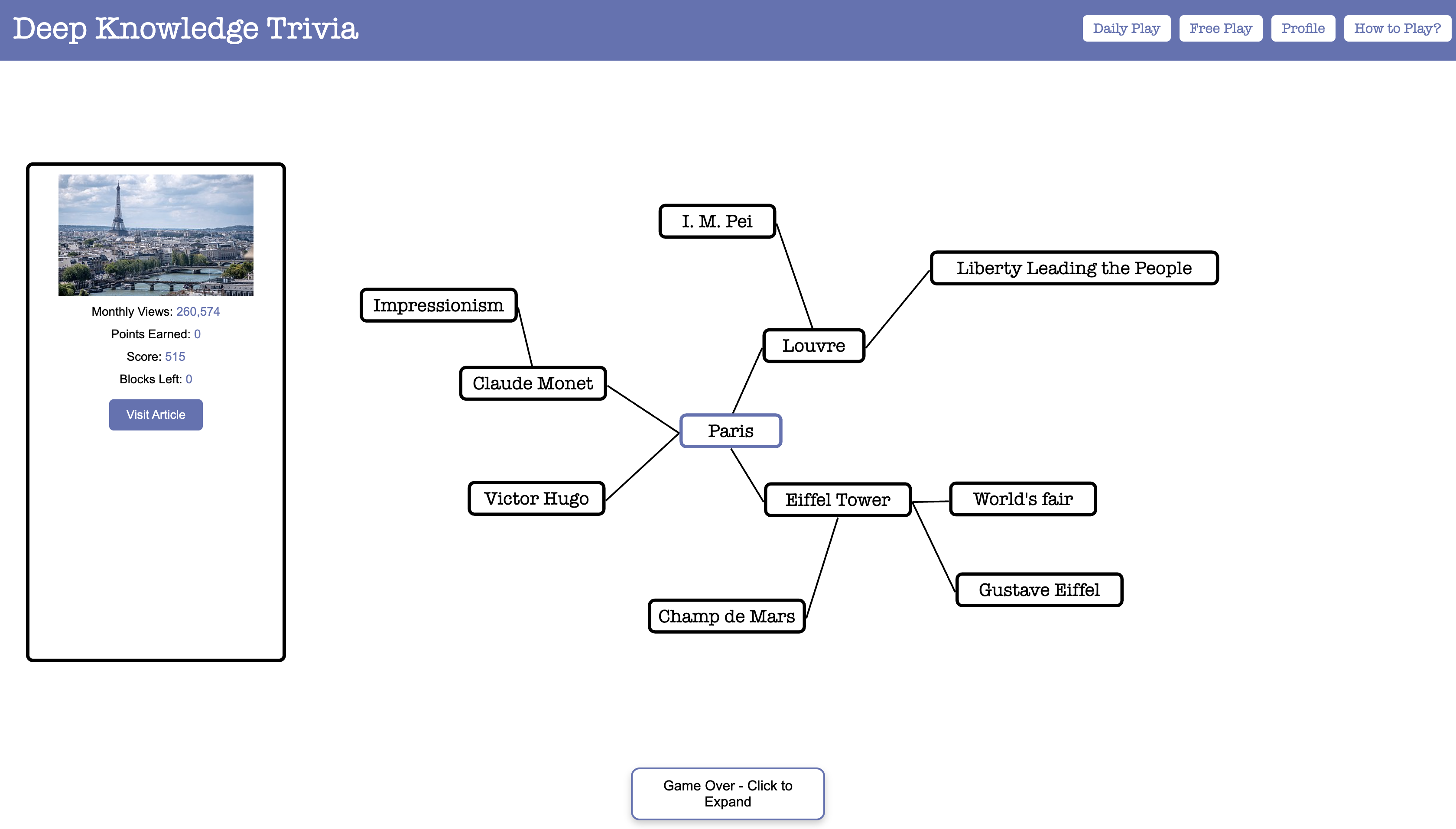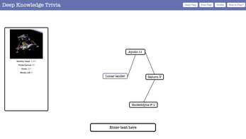 This is a trivia game without questions. The game starts with a topic block and you build a mind map around that topic. When building the mind map, you will type in knowledge and topics that relate to the selected topic, these will appear as blocks on the mind map. The more niche of an answer you give the more points that will be rewarded. There is no one right answer, just show what you know about he knowledge surrounding a topic and branch off with different paths to see what you know.